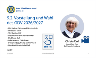 Am 25. Oktober 2025 fand die 71. Distriktkonferenz des Inner Wheel Distrikts 81 als Herbst-Distriktkonferenz erneut digital statt. Während die Sommer-Distriktkonferenz traditionell in Präsenz durchgeführt wird, findet die Herbst-DK bereits seit einiger Zeit online statt – ein Format, das sich durch gute Struktur, hohen Informationsgehalt und lebendigen Austausch bewährt hat.